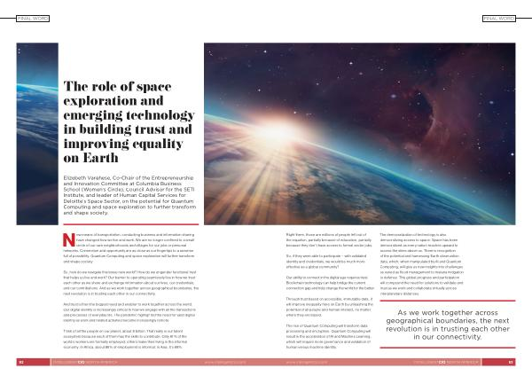 Elizebeth Varghese , Co-Chair of the Entrepreneurship and Innovation Committee at Columbia Business School ( Women ’ s Circle ), Council Advisor for the SETI Institute , and leader of Human Capital Services for Deloitte ’ s Space Sector , on the potential for Quantum Computing and space exploration to further transform and shape society .