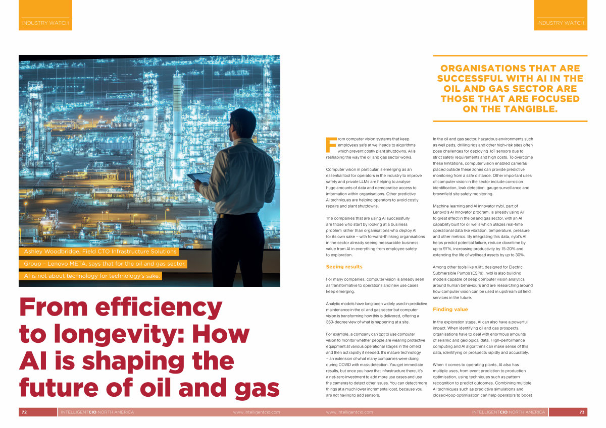 Machine learning and AI innovator nybl, part of Lenovo’ s AI Innovator program, is already using AI to great effect in the oil and gas sector, with an AI capability built for oil wells which utilizes real-time operational data like vibration, temperature, pressure and other metrics. By integrating this data, nybl’ s AI helps predict potential failure, reduce downtime by up to 97 %, increasing productivity by 15-20 % and extending the life of wellhead assets by up to 30 %.