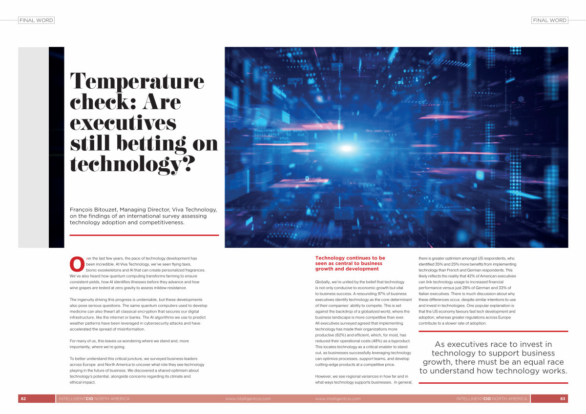 Globally, we’ re united by the belief that technology is not only conducive to economic growth but vital to business success. A resounding 97 % of business executives identify technology as the core determinant of their companies’ ability to compete. This is set against the backdrop of a globalized world, where the business landscape is more competitive than ever. All executives surveyed agreed that implementing technology has made their organizations more productive( 62 %) and efficient, which, for most, has reduced their operational costs( 48 %) as a byproduct. This locates technology as a critical enabler to stand out, as businesses successfully leveraging technology can optimize processes, support teams, and develop cutting-edge products at a competitive price.